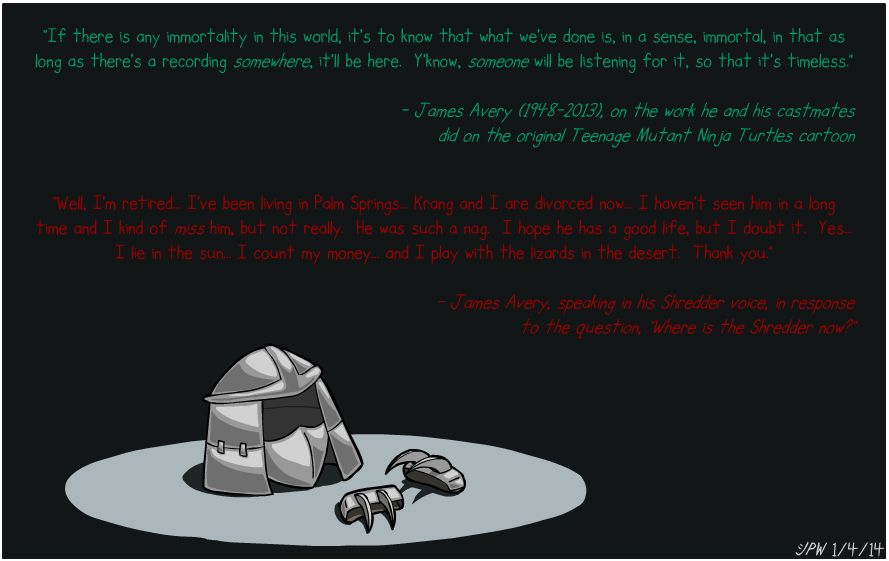 The Turtles were my favorite childhood heroes, and the original show remains my favorite cartoon to this day. Every character helped to make that cartoon as amusing and amazing as it was, and that includes the villains. It's no surprise that this animated series heavily influenced the tone I wanted to set for The Heroes of C.R.A.S.H., balancing action with character-driven comedy (And the occasional fourth-wall break). To lose a man who helped to make that show is like losing a piece of history, and by extent, a piece of my comic's history.